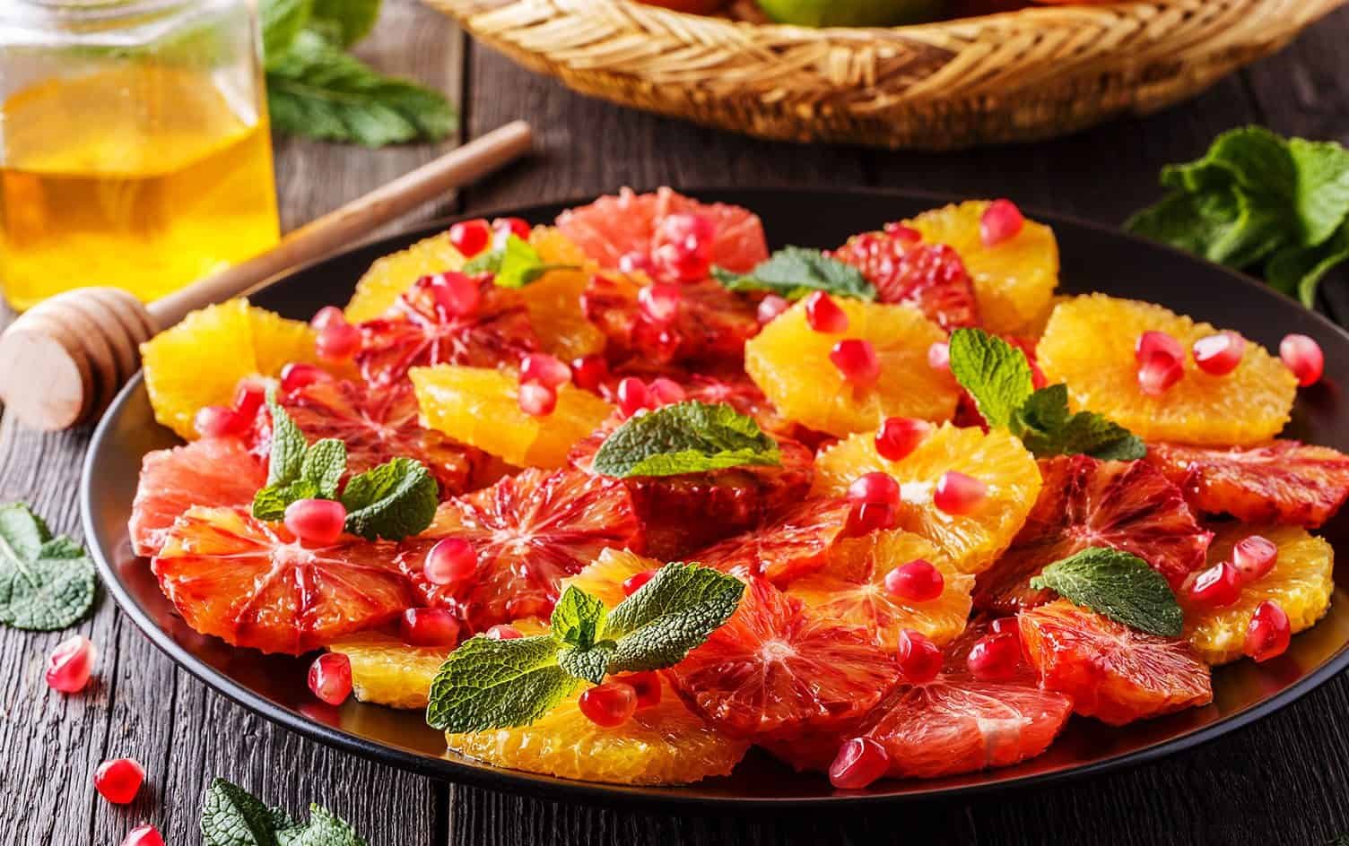 The night before: Cut the rind off a mix of citrus (tangerines, blood oranges and pink grapefruits work well together) and cut into circles. Place in a wide bowl and sprinkle with pomegranate seeds. Refrigerate overnight.