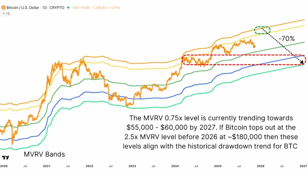 If so, and Bitcoin were to follow its historic one-year bear market lag into 2027, a 70% retracement from this level would bring the next major cycle low to around $55,000-$60,000, based on the current realized price path at that time. These prices also line up nicely with Bitcoin’s choppy consolidation area from last year to provide some technical confluence.